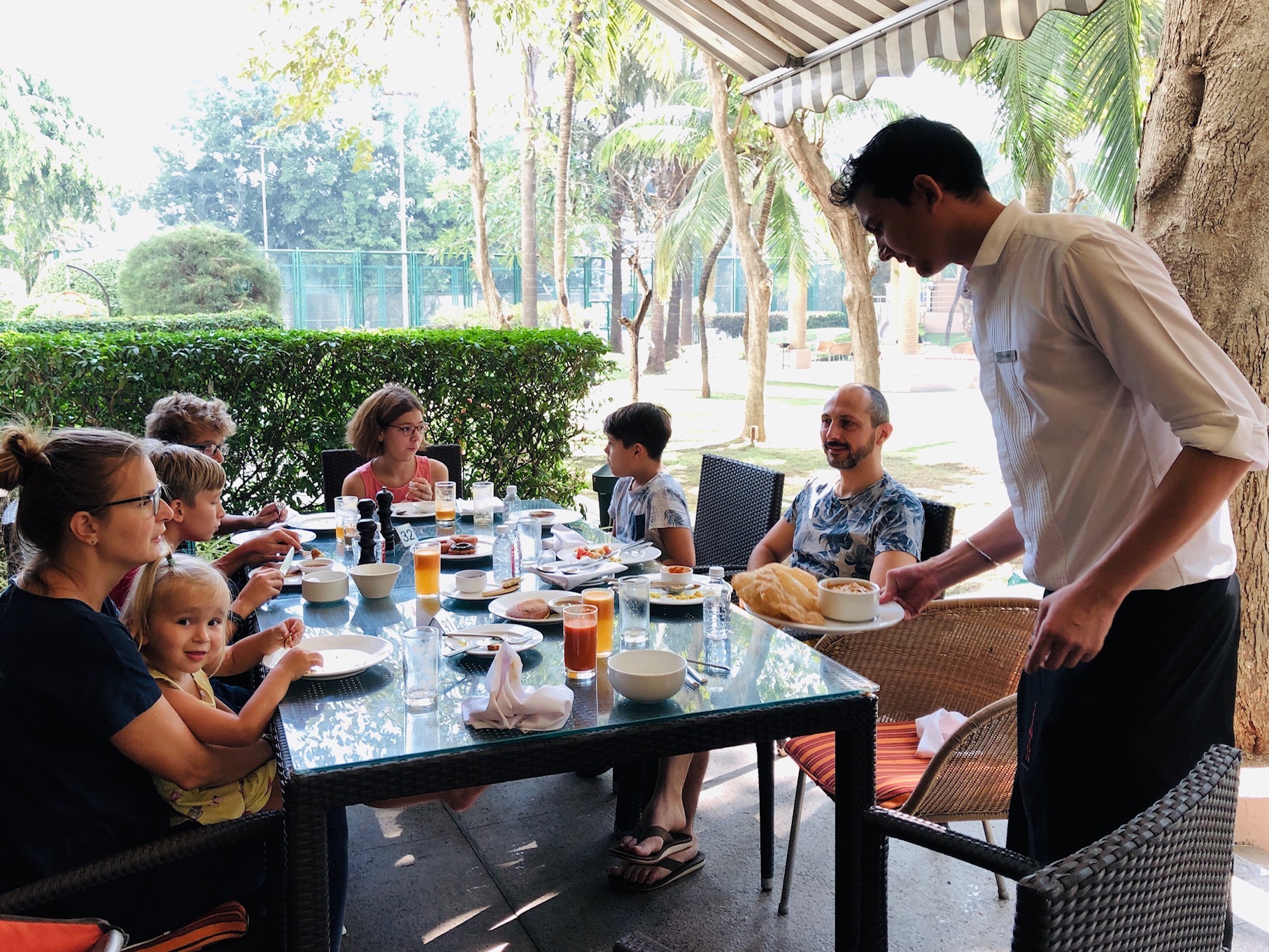 Zsuzsiéktól kaptam egy kézzel nyomott indiai kendőt (IMÁDOM), amit majd a templomokban veszek fel. És kaptam természetesen egy füzetet, ami minden ajándékozáskor elmaradhatatlan 🙂 De ennek a borítóján van egy tuk-tuk (indiai autóféleség, csak kisebbek, mint a kocsik). Volt indiai zene is a szülinapomon, amire a fiúk ritmusra hullámozták a karukat. Ezek után taxival elmentünk és Korni, az iker fiúkból az egyik bemutatta az iskoláját, amibe jár, amíg Indiában laknak. Nagyon profi volt (mármint az isi:). 3 tollas pálya, 13 lány- és fiú WC, 1 focipálya, benti- és kinti tornaterem, úszómedence. Összefoglalva egy óriási suli. Még a tanítási rendszer is jó. Volt pici pizza napközben és óriási svédasztalos vacsora este. És egészen késő estig medencézés!