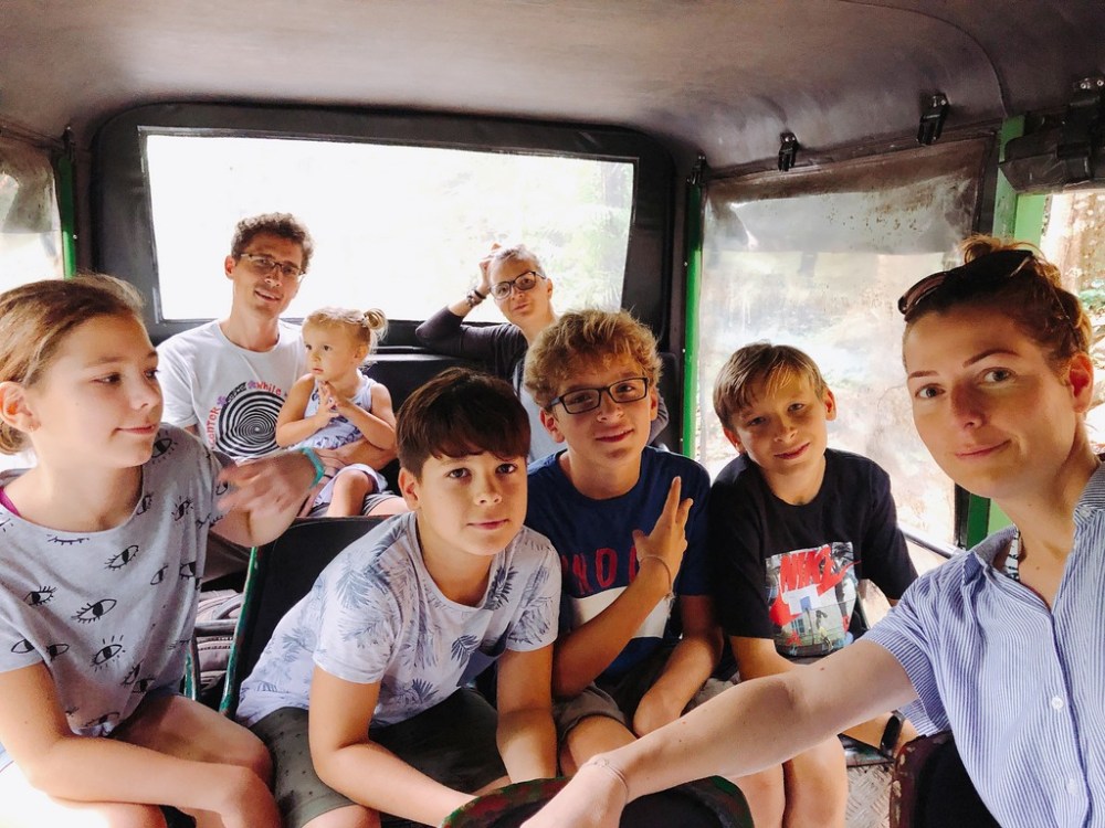 Egy hét India után folytatjuk ázsiai utunkat Malajziába, ahova természetesen mindannyian együtt megyünk. A fotón Zsuzsi és Csabi ülnek hátul, ölükbe a legdrágább és legvagányabb útitárssal a 2,5 éves Zsófival. Előttük ülnek az iker fiaik: Korni és Barni (12), mellettük a mi fiunk Soma (10) és lányunk Hanga (12), elől meg én, és Attila lemaradt a képről mert ő fotózott.