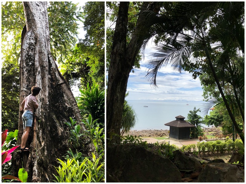 Nagyon közel vagyunk az egyenlítőhöz, a páratartalom olyan magas, hogy a kimosott ruhák napokon át nem száradnak meg, és a levegővétel is komoly gondot okoz. Kocogni tuti nem fogunk itt, de még sétálni is nehézkes. Ebben az időszakban szinte mindig van felhő az égen és legalább egyszer egy nap elkap minket egy kisebb felhőszakadás, de még így is tikkasztó a hőség. A hotel a tengerparton van, de a hozzá tartozó faházak a dzsungel kis ösvényein helyezkednek el szétszórva. Itt lakunk az égig érő fák között, bármit elcsenni kész majmokkal, hihetetlen madárhangokkal és a helyi kabócák szűnni nem akaró “ciripelésével”, ami leginkább egy nagyüzemi trafóház zajához hasonlít.